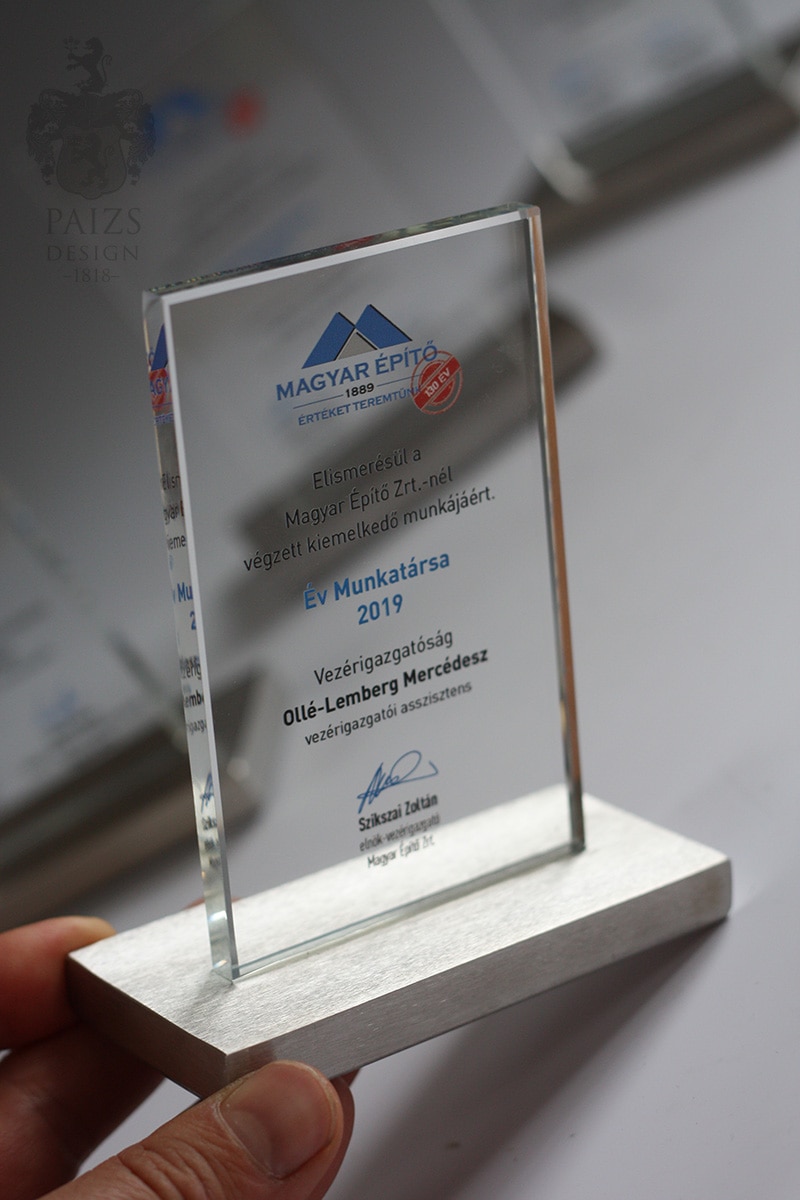Díjátadókra, gálákra különböző talapzattal (kristály üveg plexi fa fém kerámia) egyedi formával, színes nyomtatással gravírozással készült díjak plakettek. Kis és nagy, ill. egyedi méretekben céges arculathoz, eseményekre alakított emléktárgyak készítése.